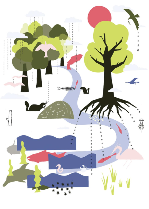In a healthy flowscape, as rain soaks through forest floors, it picks up nutrients from decaying leaves and soil. As water carries those nutrients to the sea, forest roots filter pollution and tree canopies keep the water cool. The nutrients feed plankton, plankton feed fish, and the ocean thrives on food sent from the forest.